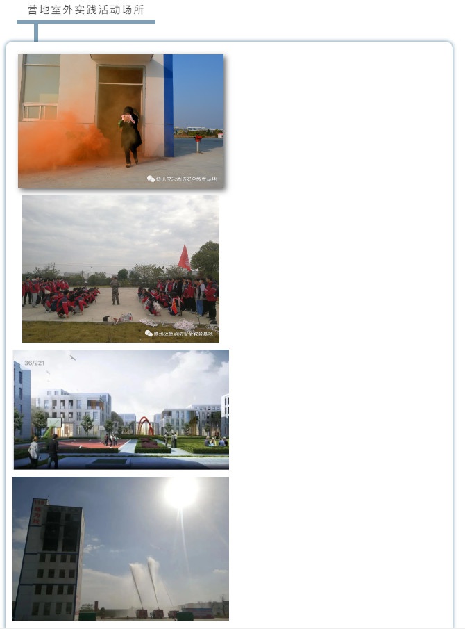 营地将安全理念同步实施于设计、建设、运营三大过程中,安全馆内设置40多个体验项目,包括消防、交通、急救、自然灾害、地质灾害等;室外建有消防体验区、急救学习区、防溺水区、演练区、试飞行区、工具使用区及儿童游乐区,用情景体验、寓教于乐的方式开展安全科普活动,帮助丰富中小学生应急安全知识,提高社会民众应急自救能力。
